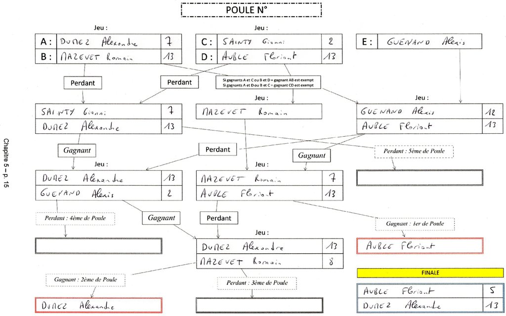 En G15, deux joueurs du Centre participaient à cette compétition. Antoine Charbonnier (Larçay) s'impose 13 à 8 et 13 à 5 face à Paul Marchand (Belhomert) et se qualifie ainsi pour les Championnats de France à Auxerre.