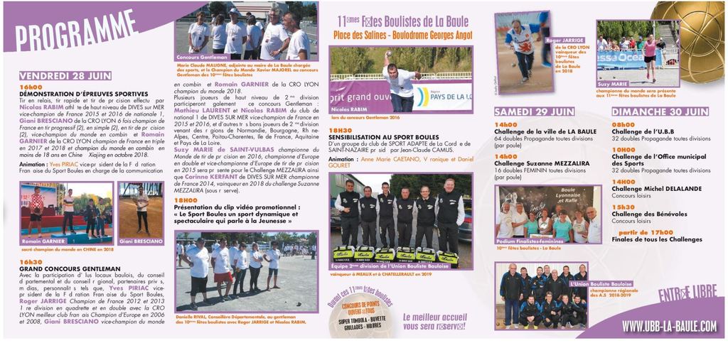 En effet du vendredi 28 juin au dimanche 30 juin l' UBB organise sa traditionnelle fête bouliste ( voir le dépliant ci-joint) avec un point d'orgue le samedi 29, sur la place Saline à la Baule, le concours 64 Db Propagande TD masculin et le 16 Db Propagande TD Féminin avec des championnes de France d'Europe et du Monde .