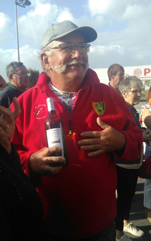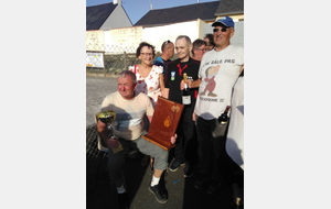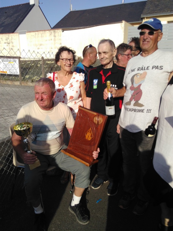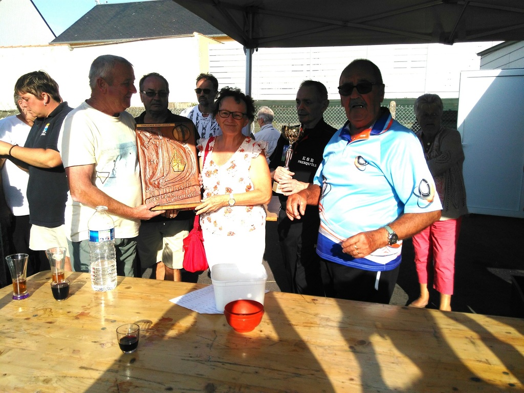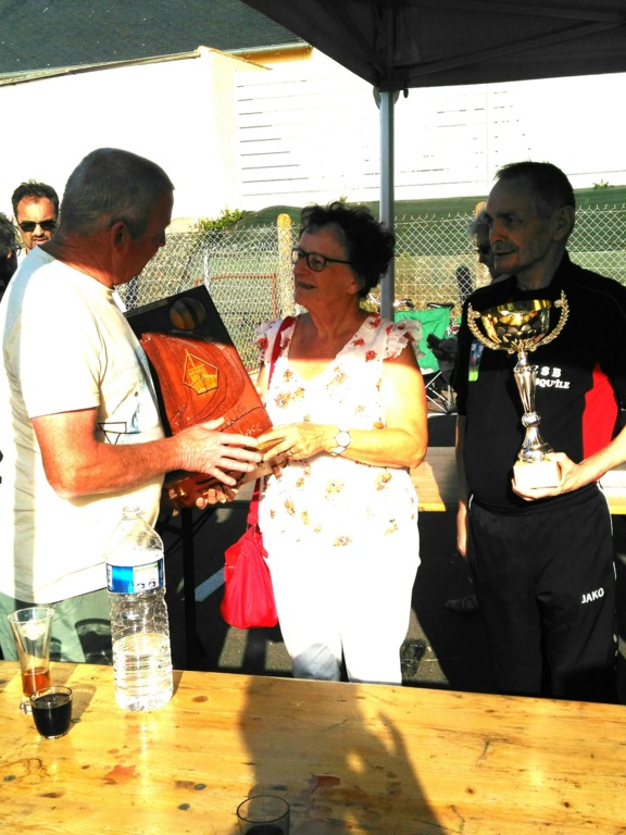 Mais comme toute compétition il faut un vainqueur et notre ami Georges Ami d'Herve Hamon se porte volontaire. Mme LEROUX lui remet le challenge entourée du Président de la Turballe et de son speeker Yves.