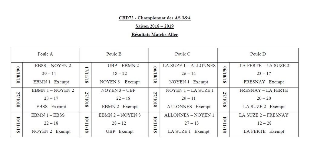 Vous trouverez en fichiers joints les résultats et classements des 4 poules du championnat des AS de la Sarthe.