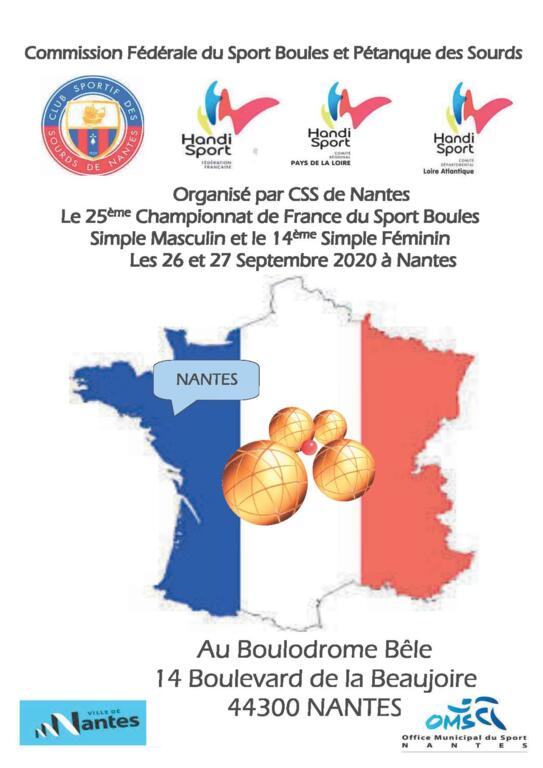 Les Championnats de France simple masculin et féminin de Sport-Boules pour les Sourds seront organisés par le CSS de Nantes au boulodrome du Bêle les 26 et 27 septembre 2020.