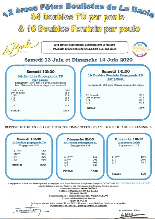 Nous aurons naturellement l'occasion de revenir sur l'événement mais en avant première le Président de la Baule , Hervé Albaladéjo, nous propose l'affiche du Grand concours de l' UBB pour le 64 Db TD et le 16 DB féminin par poule du 13 et 14 juin 2020.