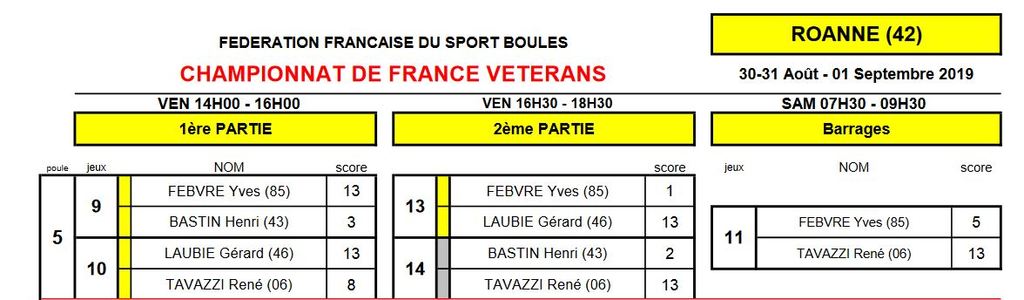 Nos représentants vétérans de la ligue se sont dépacés ce we à Roanne (42), pour le Championnat de France, malheureusement l'équipe FEBVRE (FEBVRE Yves, KIRIE Dominique, MOREAU Jacques, GROBON Jean et POIREAU Jean ) du 85 s'est inclinée au barrage; bravo quand même pour le titre de champion de région.
